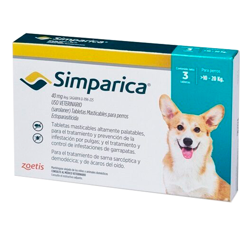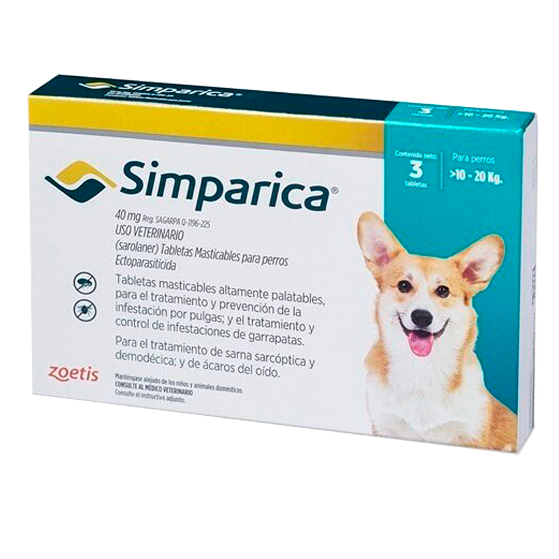 Simparica está indicado para el tratamiento y control de infestaciones por pulgas (Ctenocephalides felis, Ctenocephalides canis) y el tratamiento y control de infestaciones por la garrapata café del perro (Rhipicephalus sanguineus). Simparica está indicado para el tratamiento de la sarna causada por Sarcoptes sca...