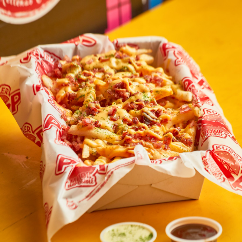 Deliciosa cama de papas con tocineta crocante bañadas en queso chedar fundido