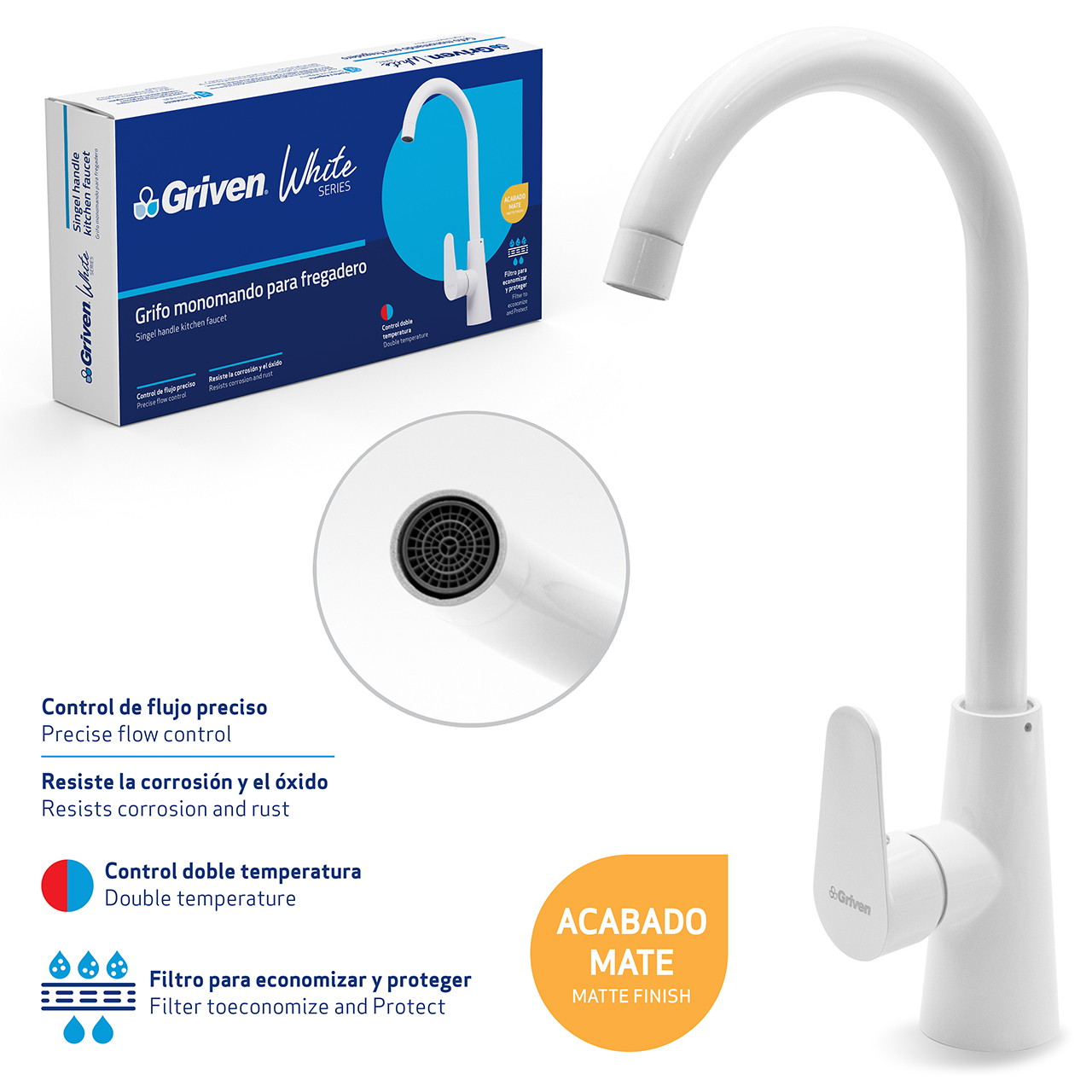 GRIFO MONOMANDO PARA FREGADERO ACERO INOXIDABLE ACABADO BLANCO MATE