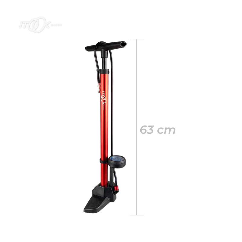Bomba de piso de aluminio CNC, 150 PSI, color rojo. Calidad profesional para todo tipo de llantas. Envíos a Bogotá y toda Colombia. ¡Infla rápido!