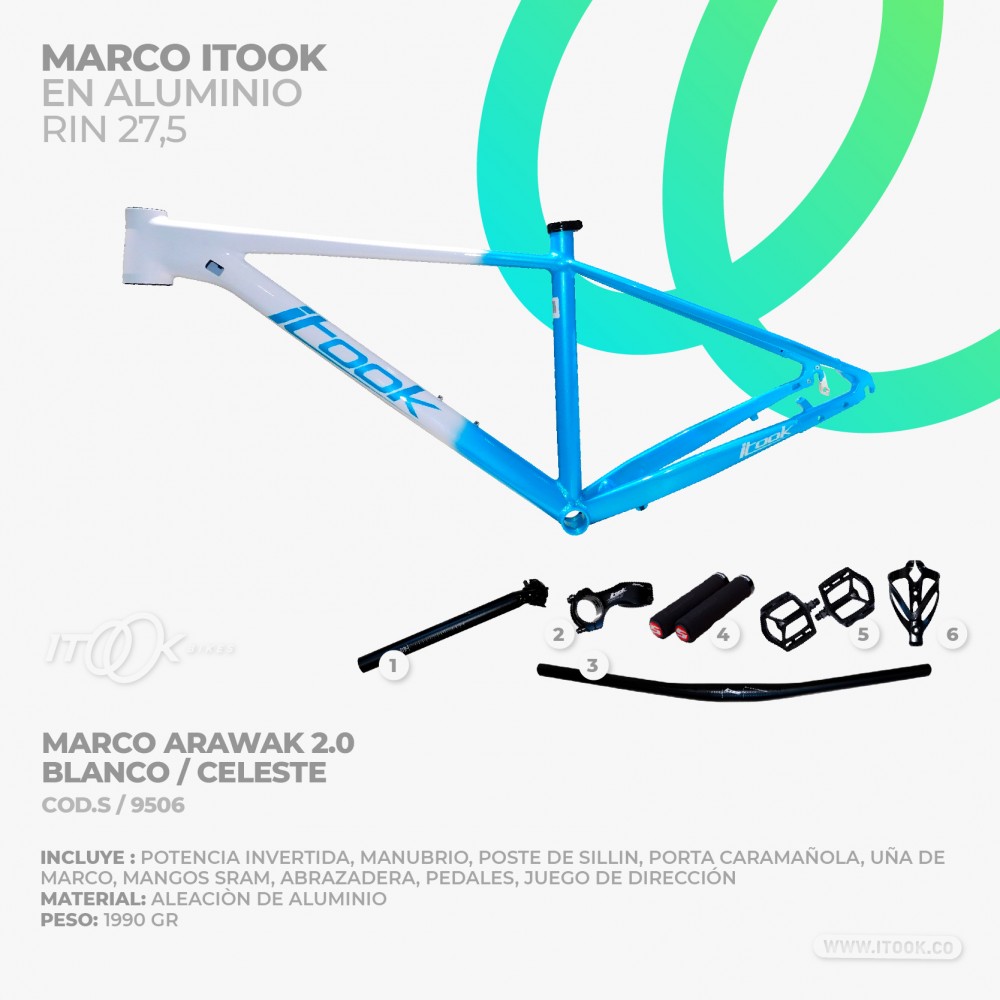 POTENCIA INVERTIDA, MANUBRIO, POSTE DE SILLIN, PORTA CARAMAÑOLA, UÑA DEL MARCO, ABRAZADERA, PEDALES, JUEGO DE DIRECCION Y CAJA DE CENTRO.