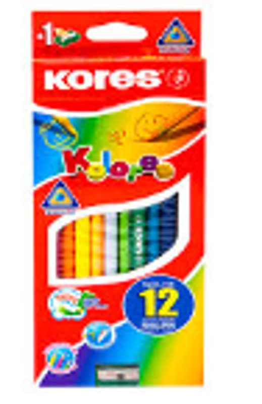 Colores Kores x12 + tajalápiz triangular, colores vibrantes, incluye tajalápiz, ideal para dibujos precisos.