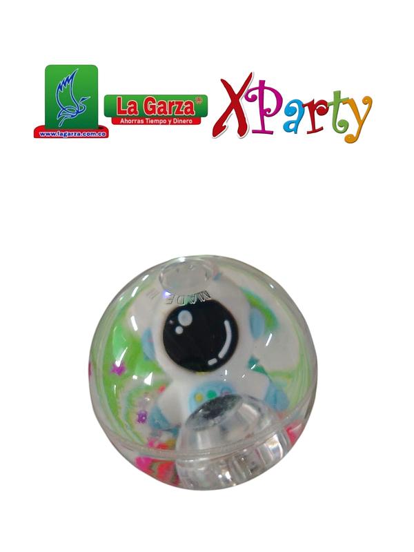 Pelota de goma con luces LED y figuras internas, divertida y segura para juegos dinámicos y creativos.