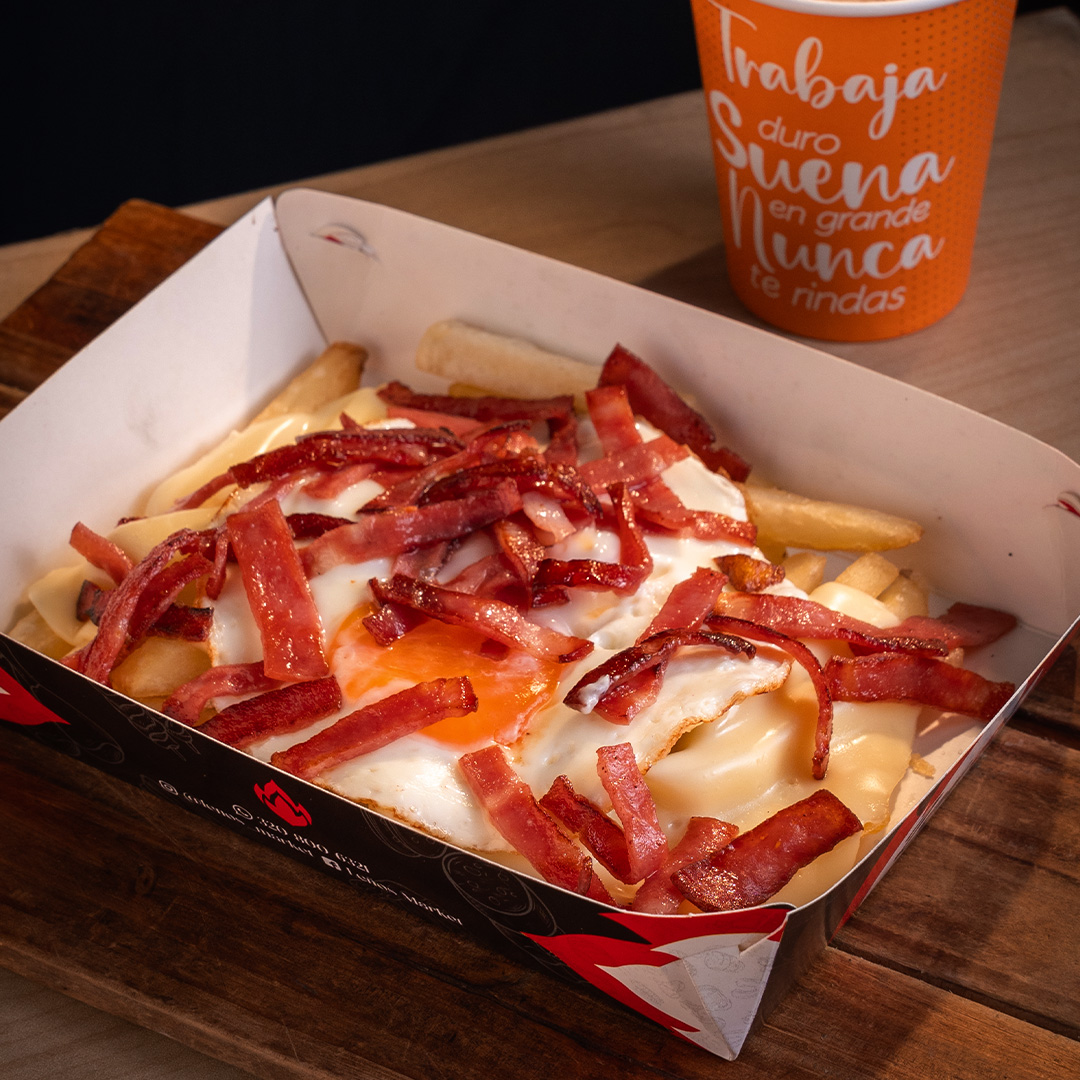 Huevo frito, papa rústica, tocineta, queso, hogao y croissant