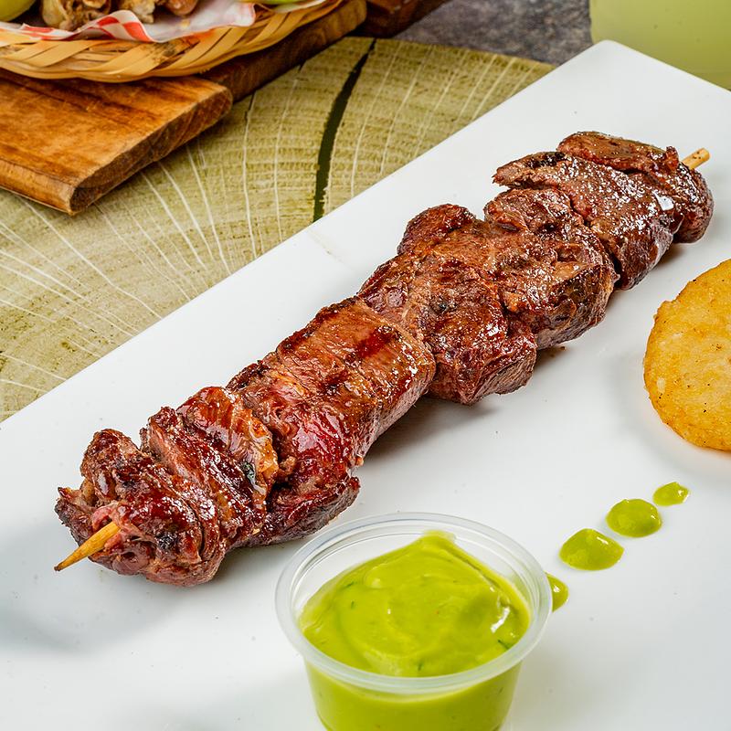Pincho de lomo de res, con arepa blanca frita y guacamole