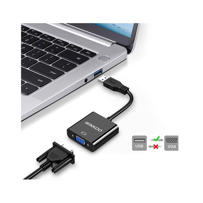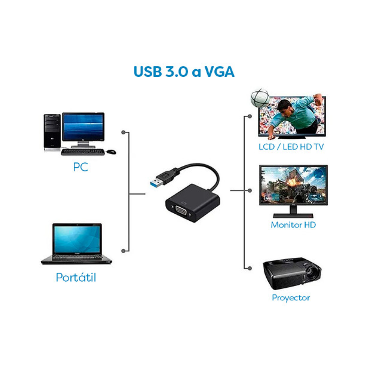 Este adaptador convierte un puerto USB 3.0 en una salida VGA, permitiéndote conectar fácilmente tu laptop o computador a una pantalla externa, monitor, proyector o televisor con entrada VGA.