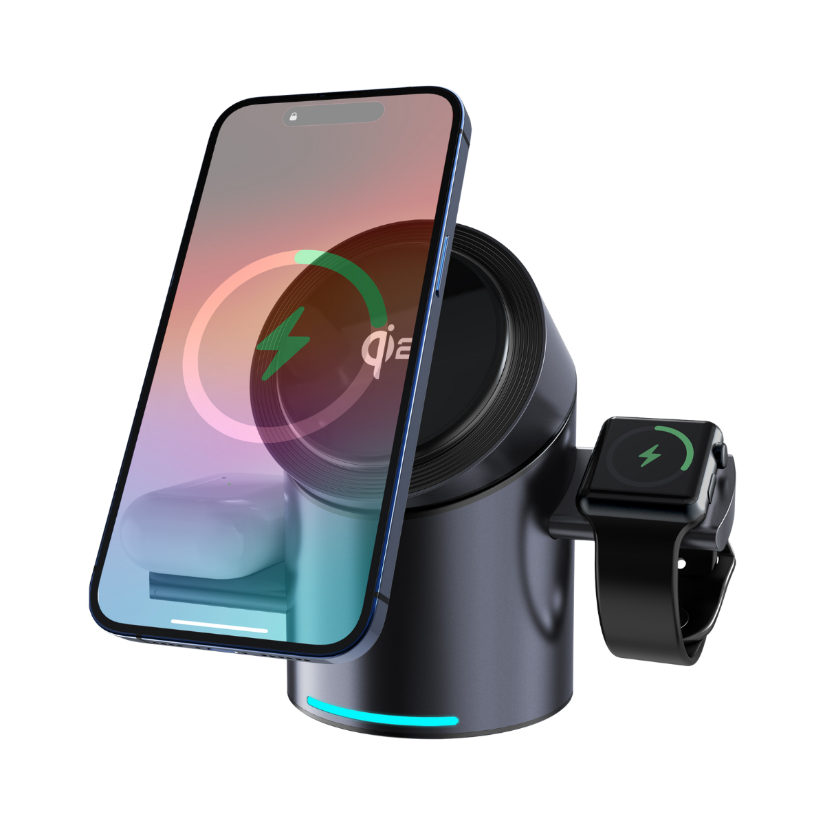 Permite cargar al mismo tiempo el celular, reloj inteligente y audífonos, incluyendo AirPods y Apple Watch. Es compatible con dispositivos Qi y MagSafe, tanto iPhone como equipos Android con carga inalámbrica o imanes compatibles. Incluye cable Tipo C y puede ajustarse en diferentes posiciones para mayor comodidad y versatilidad en el uso diario.