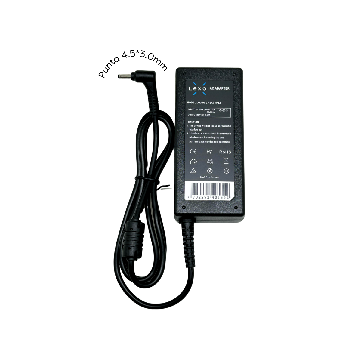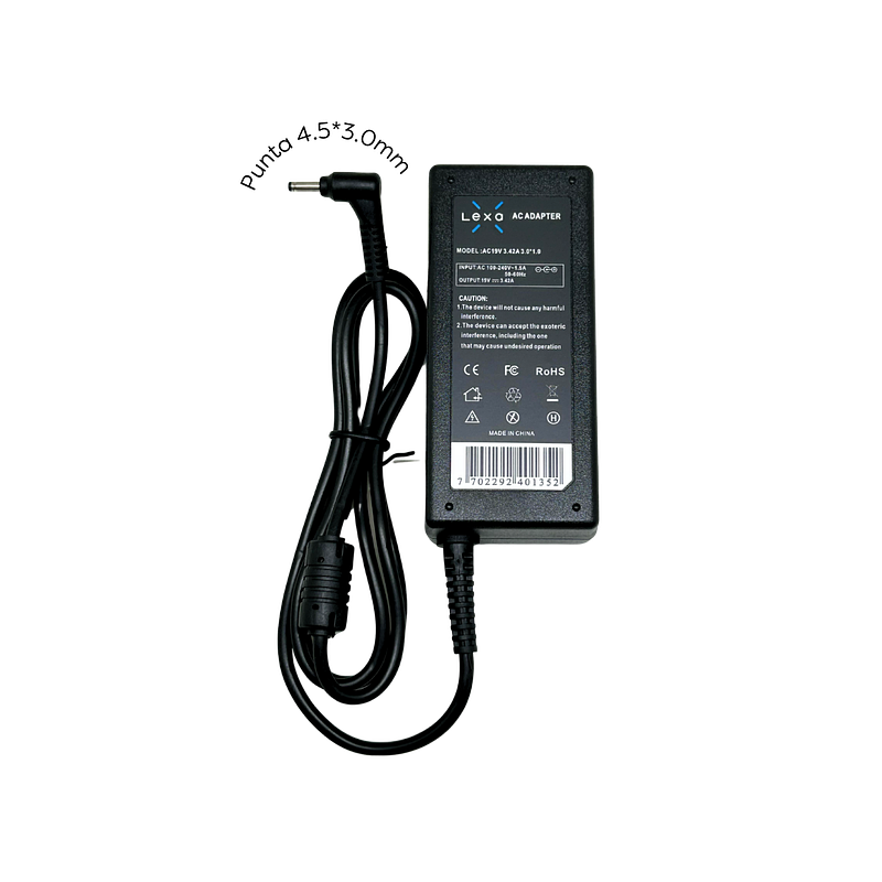 Adaptador de corriente 45W para laptops 19V 2.37A, con conector 4.5*3.0mm, compacto, resistente y confiable.