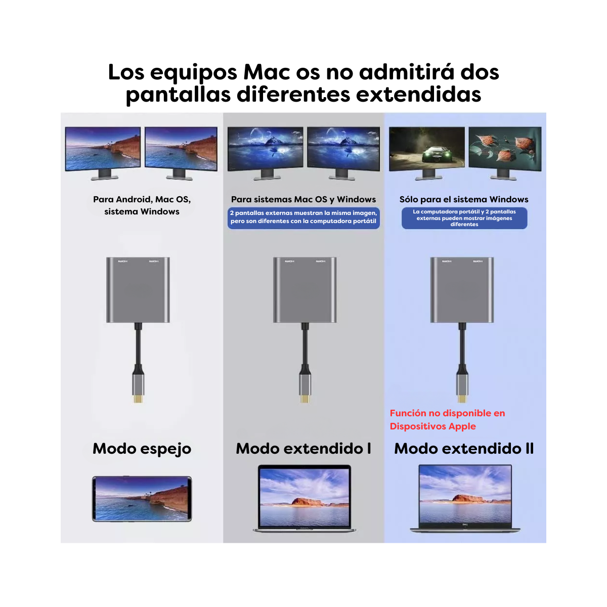 Tenga en cuenta que la computadora portátil Mac solo admite el modo espejo (NO PUEDE extender 2 imágenes diferentes en los monitores).