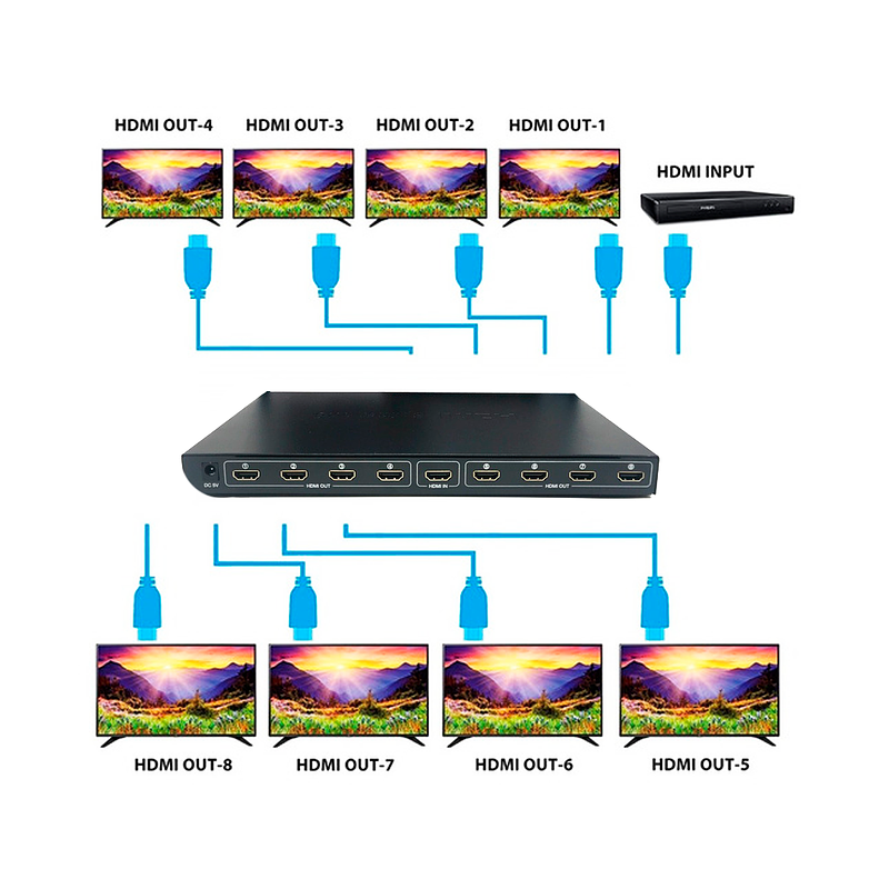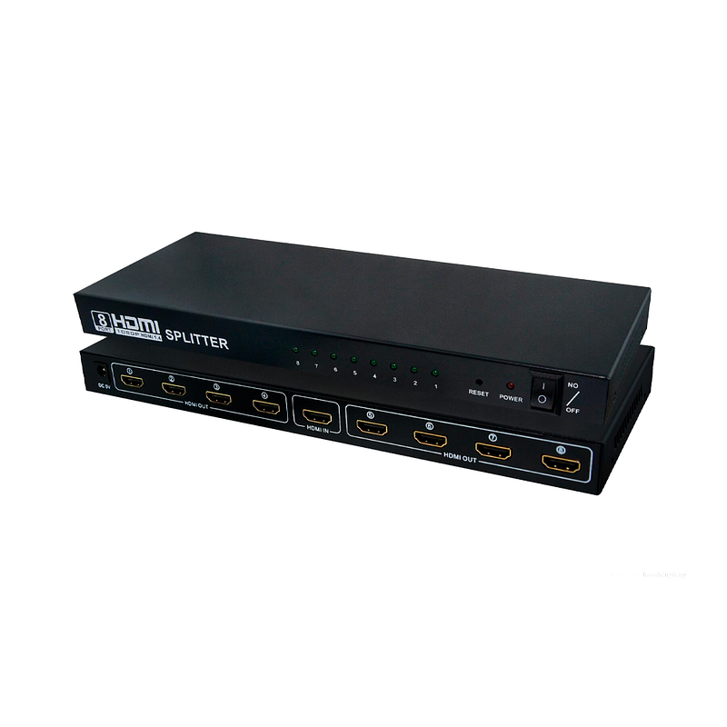 Splitter HDMI que permite multiplicar una salida HDMI para proyectar en 8 pantallas la misma imagen.