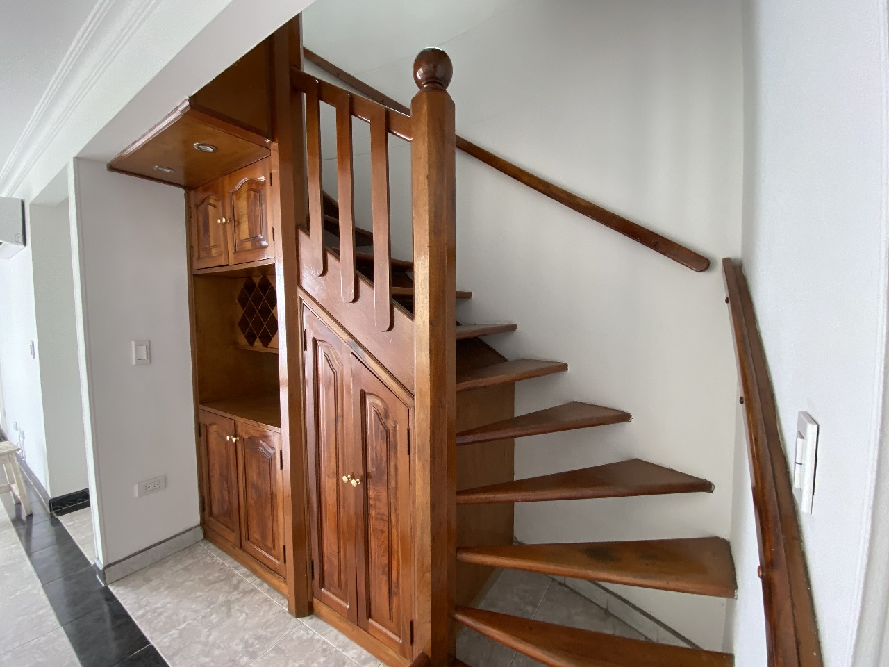 Dependencias: piso 1: sala-comedor, cocina integral, estudio, 2 alcobas auxiliares con closet, baño, zona de ropas, alcoba de servicio con baño. Piso 2: escalera en madera, terraza, alcoba principal con baño y closet. Además de 2 parqueaderos privados de 10 m2 cada uno.