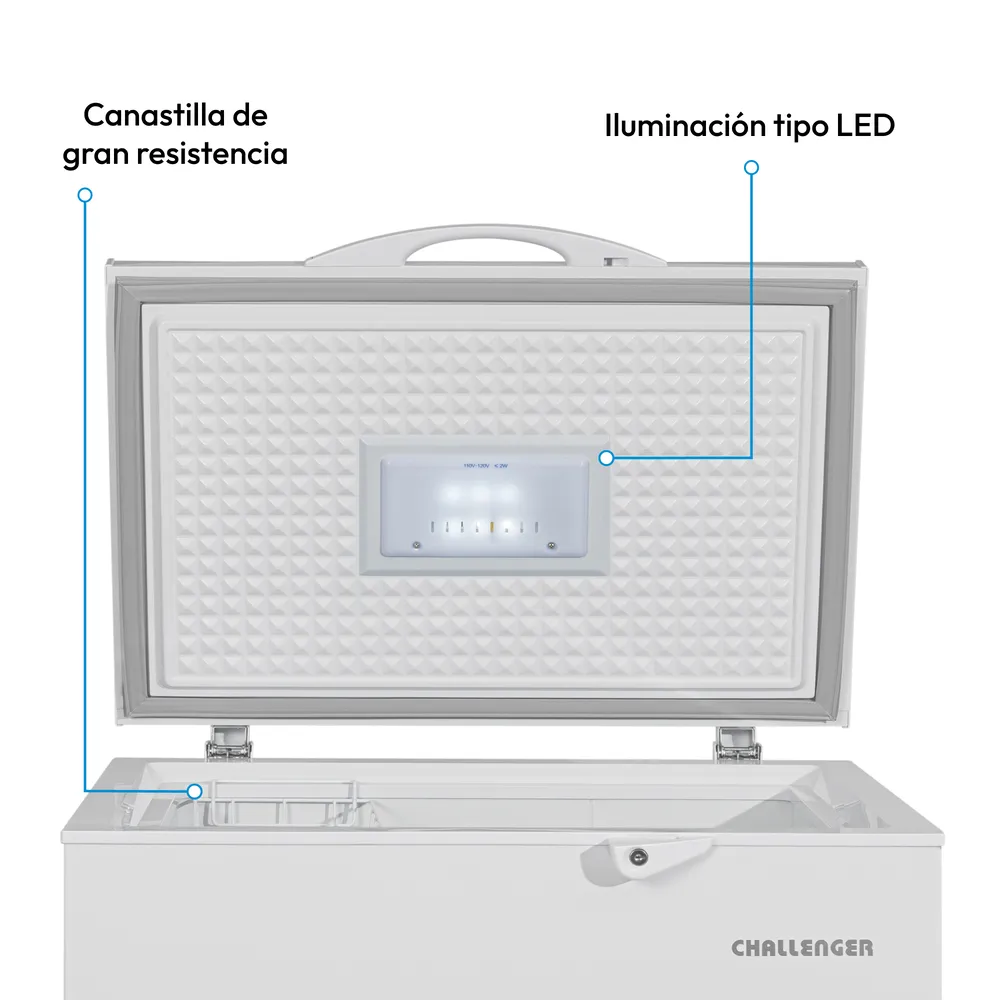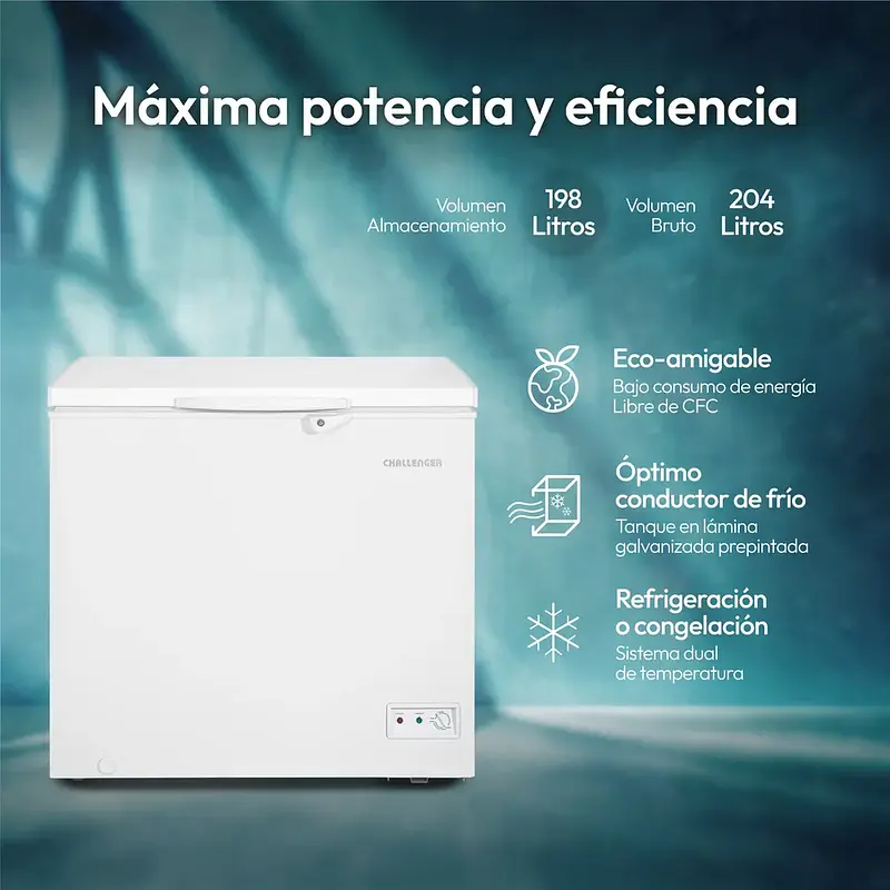 El Congelador Horizontal Challenger de 204 litros ofrece una solución práctica y segura para conservar tus alimentos. Su diseño incluye chapa de seguridad, dos patas niveladoras y dos rodachines que facilitan su movilidad. Está construido con lámina galvanizada prepintada tanto interna como externamente, lo que garantiza durabilidad. Incorpora condensador interno para una limpieza más sencilla, sistema dual de temperaturas (refrigerador y congelador), empaque de compresión removible, iluminación LED, bajo nivel de ruido y una canastilla resistente para una mejor organización. Ideal para hogares que buscan eficiencia y versatilidad.