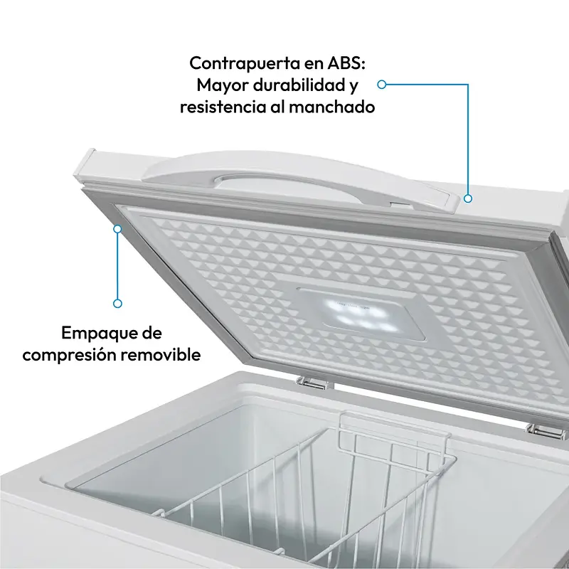 Gracias al empaque de compresión removible, la limpieza del congelador es rápida y sencilla. Este diseño permite retirar el empaque fácilmente para lavar y desinfectar, ayudando a mantener el interior siempre fresco, reluciente y libre de residuos, sin esfuerzo adicional. Ideal para quienes valoran la practicidad y el cuidado del hogar.
