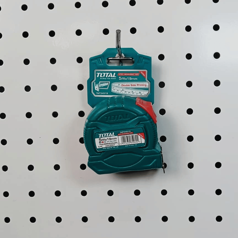 Cinta Métrica Total 5M x 19MM Pasta, resistente y precisa, ideal para medir con seguridad en trabajos industriales, construcción y hogar.