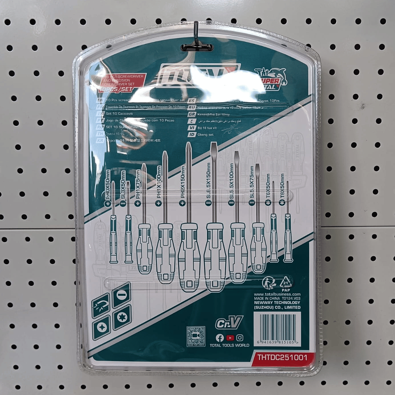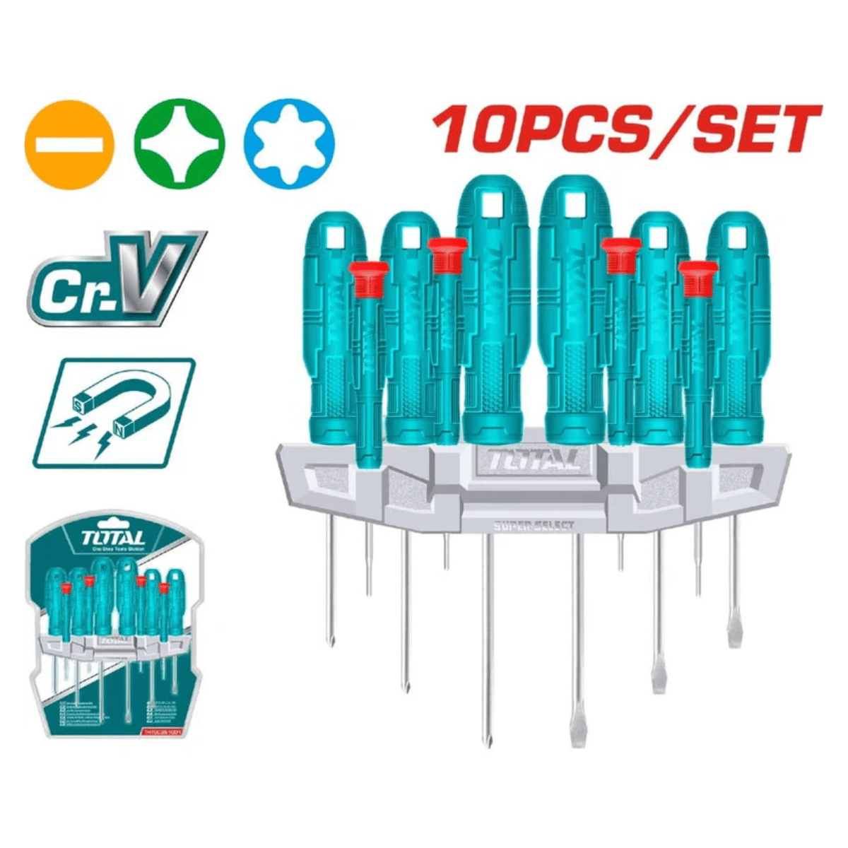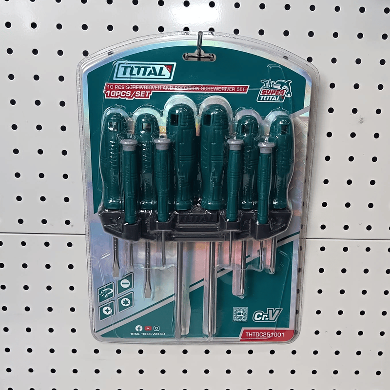 Este completo juego de 10 destornilladores Total está fabricado en acero Cromo Vanadio (CR-V), reconocido por su máxima durabilidad 💪, resistencia al desgaste 🔩 y desempeño profesional en cada uso ⚡.