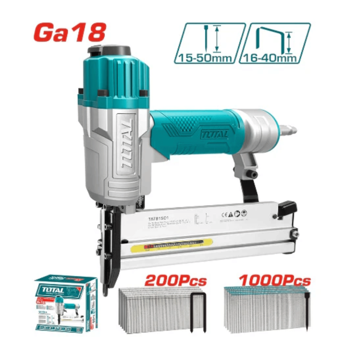 ⚙️ Compatible con clavos de 15–50 mm y grapas de 16–40 mm calibre 18, ofreciendo versatilidad y eficiencia en un solo equipo.