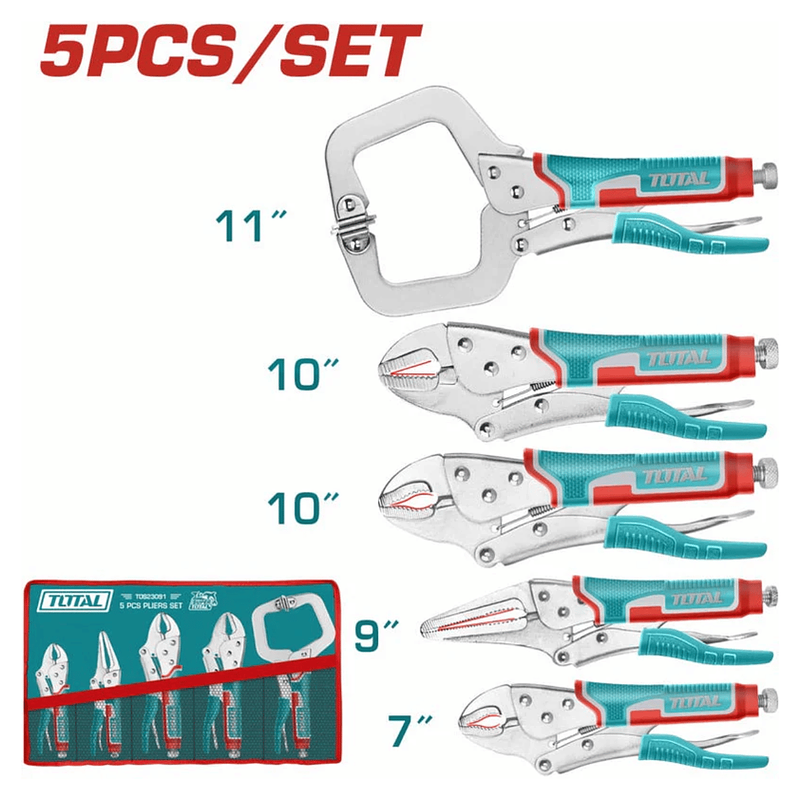 El Juego de Alicates de Presión TOTAL de 5 piezas es la elección perfecta para profesionales que buscan versatilidad, precisión y durabilidad en sus trabajos. Este set incluye herramientas de diferentes formas y tamaños, pensadas para ofrecer ajuste firme, sujeción segura y control total en tareas de carpintería, mecánica, construcción e industria.