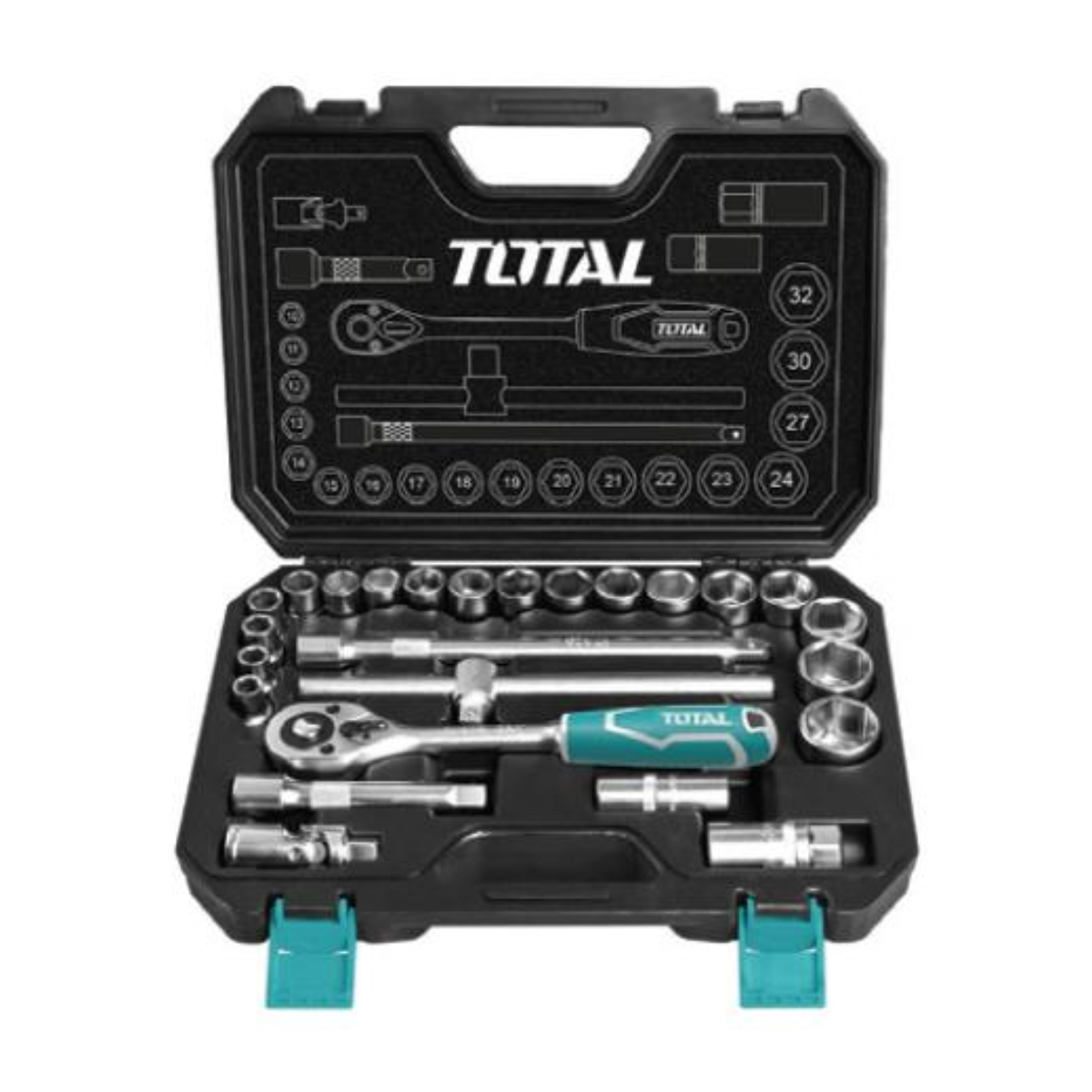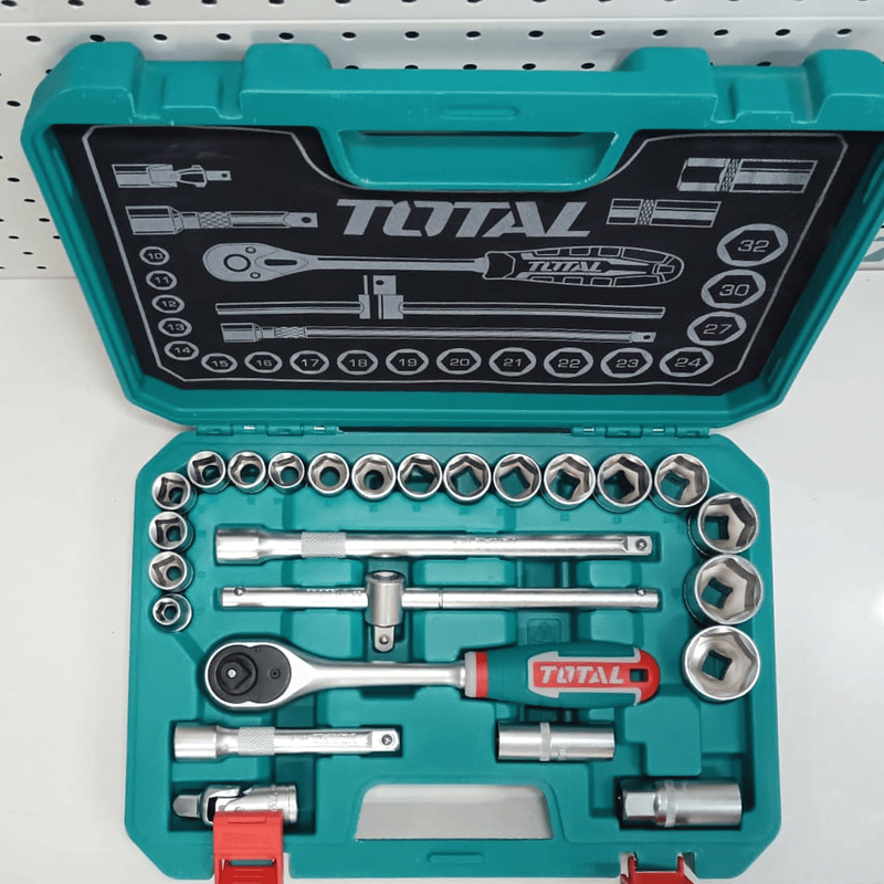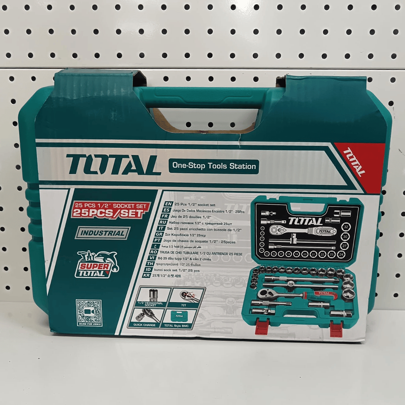 Con el Juego de Copas y Ratchet 1/2" TOTAL – 25 Piezas, tendrás herramientas confiables, resistentes y versátiles, diseñadas para maximizar la eficiencia, precisión y comodidad en cada tarea, convirtiéndose en un aliado indispensable para el trabajo diario.