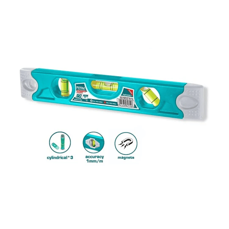 Nivel Torpedo Total 225 mm con borde de aluminio y cuerpo de pasta resistente. Precisión, ligereza y durabilidad para nivelaciones rápidas en albañile