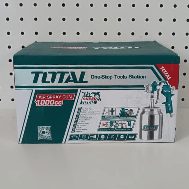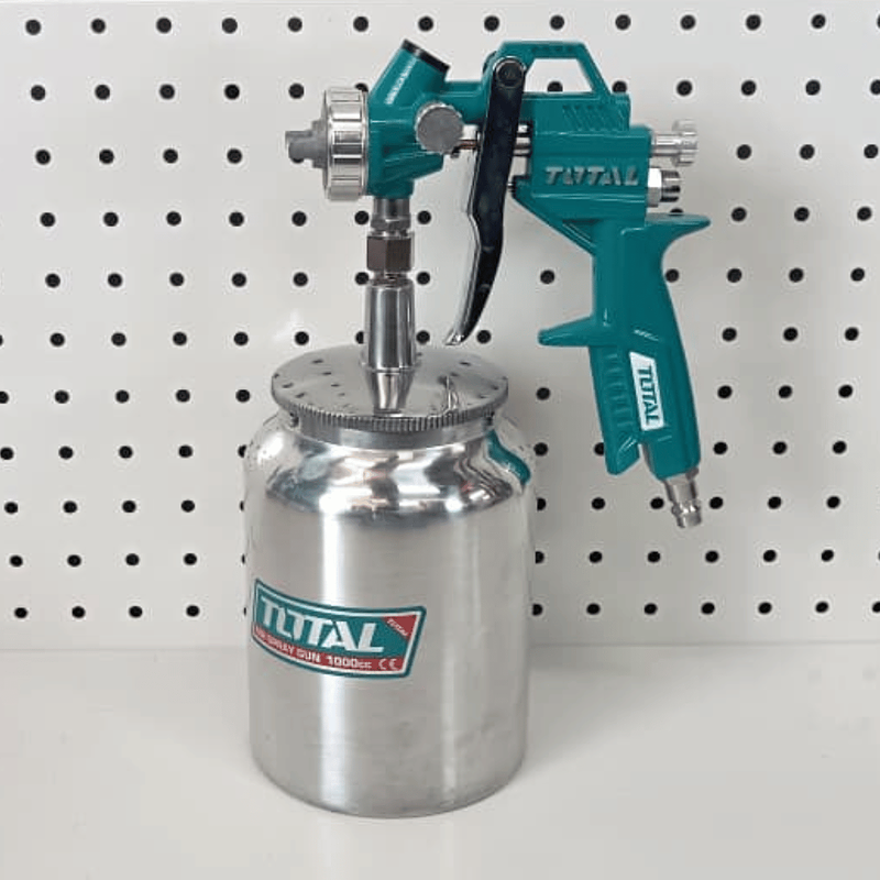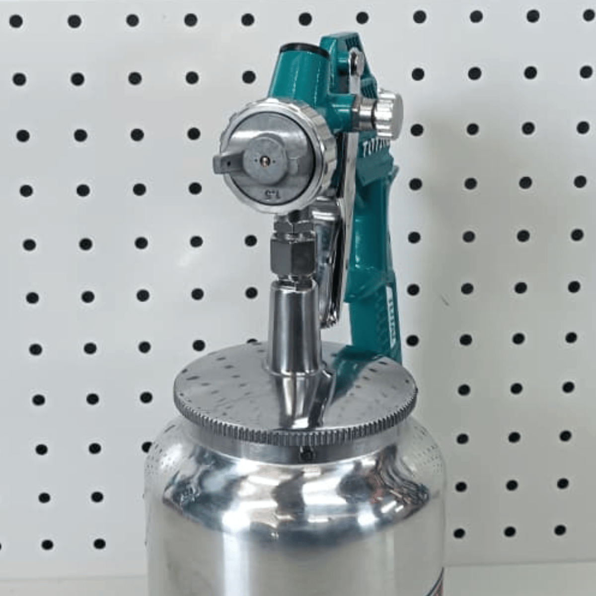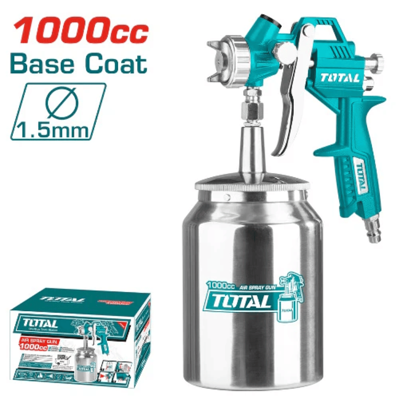 Pistola de pintar Total 1.5mm con vaso de 1000cc para capa base. Precisión, capacidad y versatilidad para acabados profesionales y uniformes.