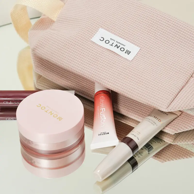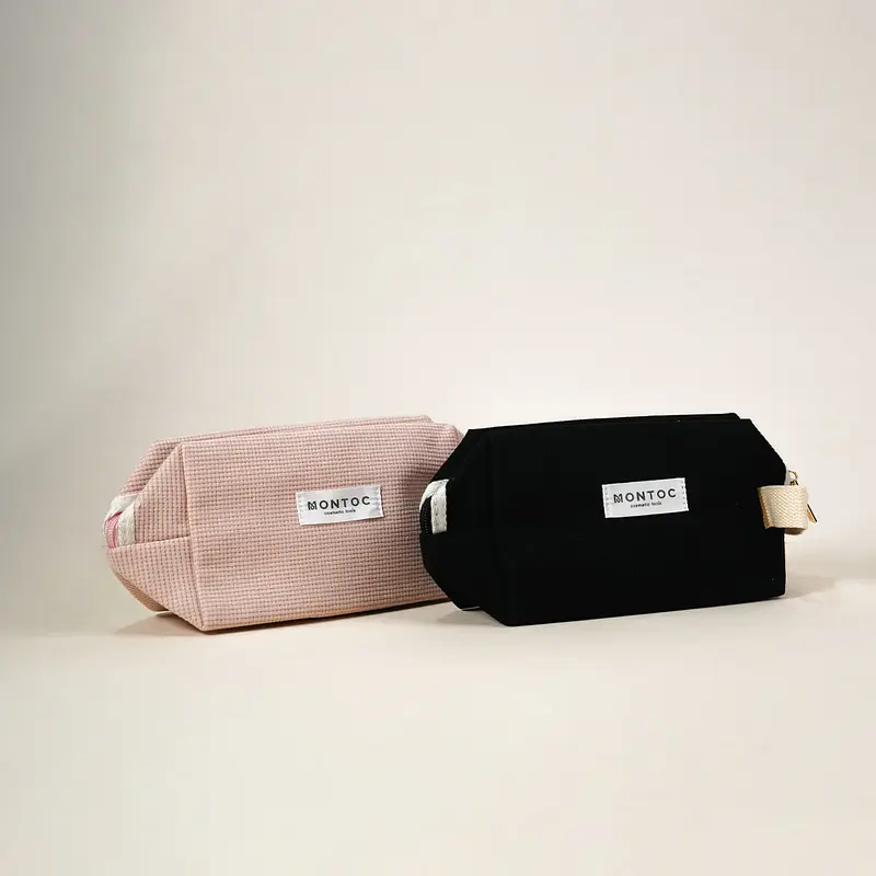 Cosmetiquera con exterior de tela y forro plástico interno para mayor protección. Sus medidas (9 x 10 x 18 cm) permiten guardar desde polvos compactos hasta labiales y pequeños accesorios.