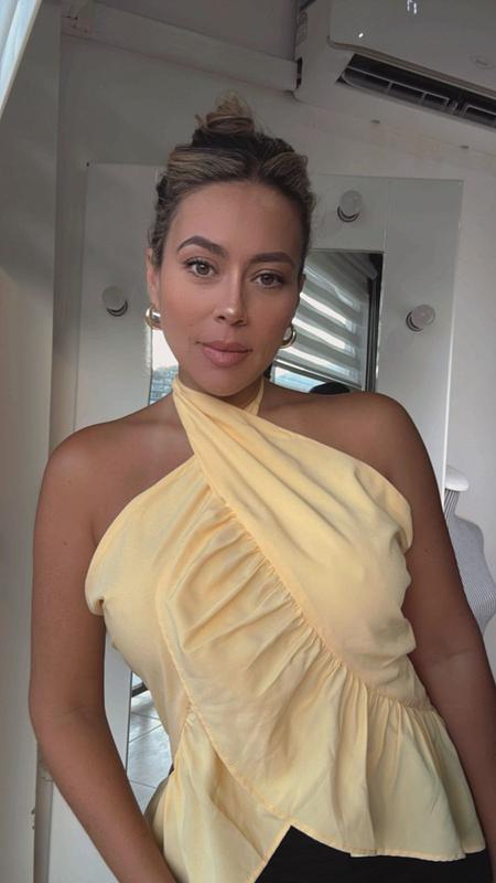 Destaca tu estilo con esta encantadora blusa amarilla de tiras, diseñada con un delicado bolero que añade un toque femenino y moderno.