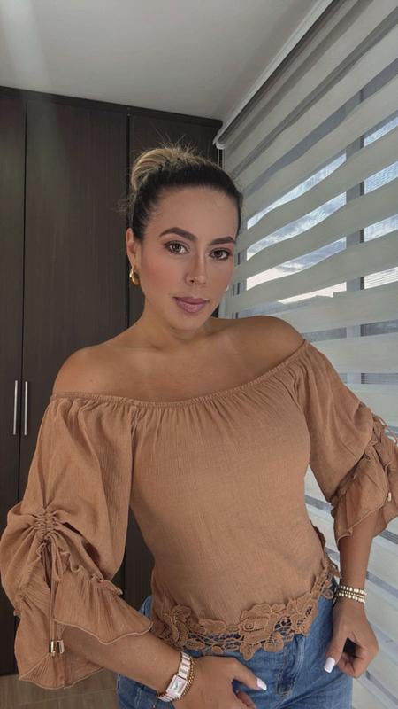 Blusa de manga larga tipo bandeja, escote amplio que resalta hombros, ajuste ceñido y tela suave. Elegante y femenina, perfecta para looks casuales.