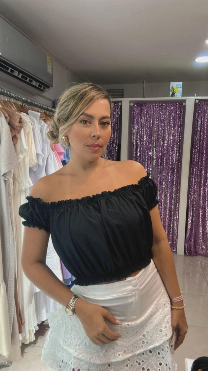 Blusa negra corta, estilo bandeja, con mangas globo que aportan volumen y elegancia. Ideal para looks modernos y femeninos.