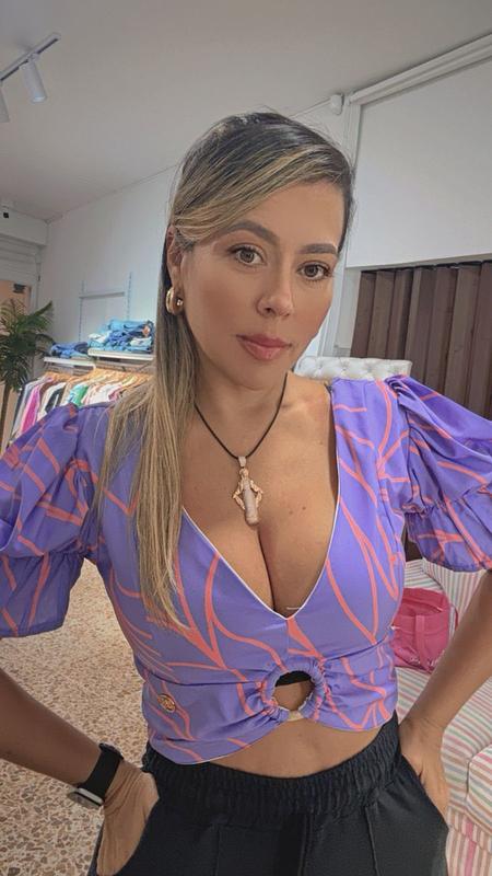 Blusa en tono morado vibrante con acentos rosados eléctricos que añaden un toque moderno y llamativo.