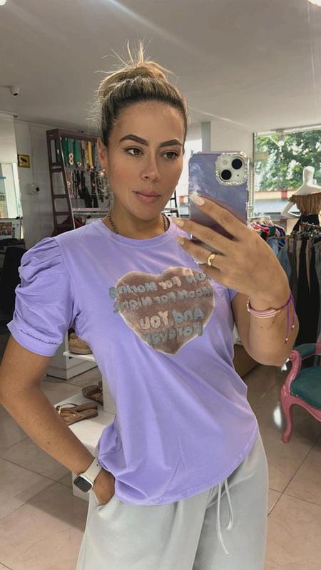 Camiseta lila con manga bombacha, moderna y femenina, ideal para un look casual con un toque elegante.