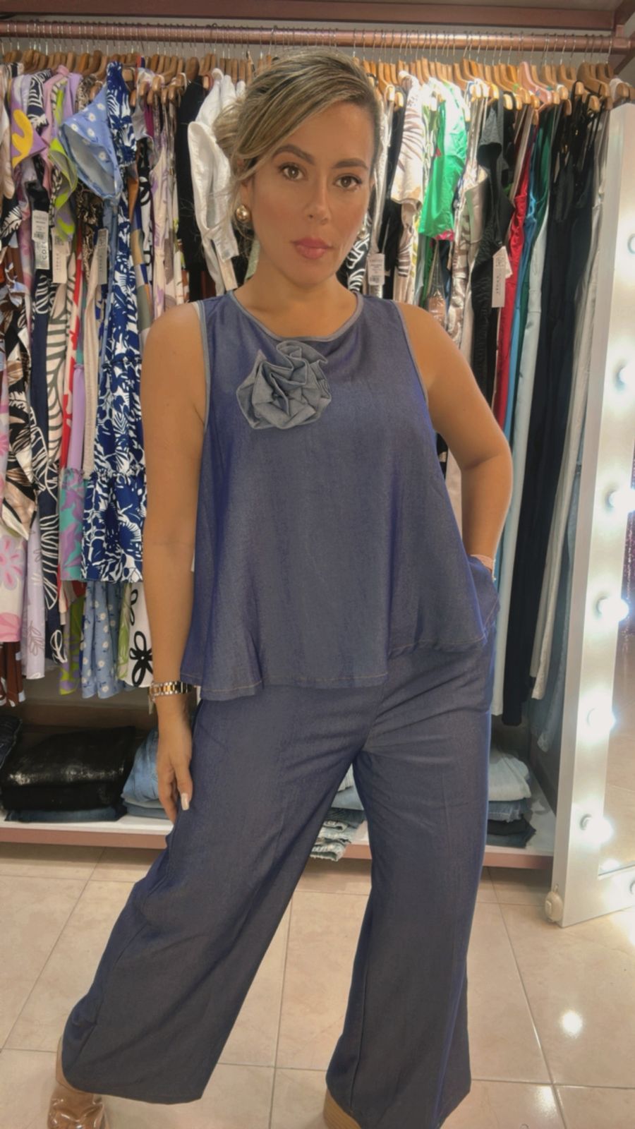 Set hermoso en tela fresca, ligero y cómodo. Diseño moderno con detalle floral, ideal para looks elegantes y casuales. Perfecto para sentirte fresca