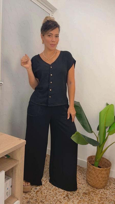 Set divino y cómodo en tela fresca, suave y ligera. Su caída elegante estiliza tu figura y te brinda libertad y sofisticación en cada paso.