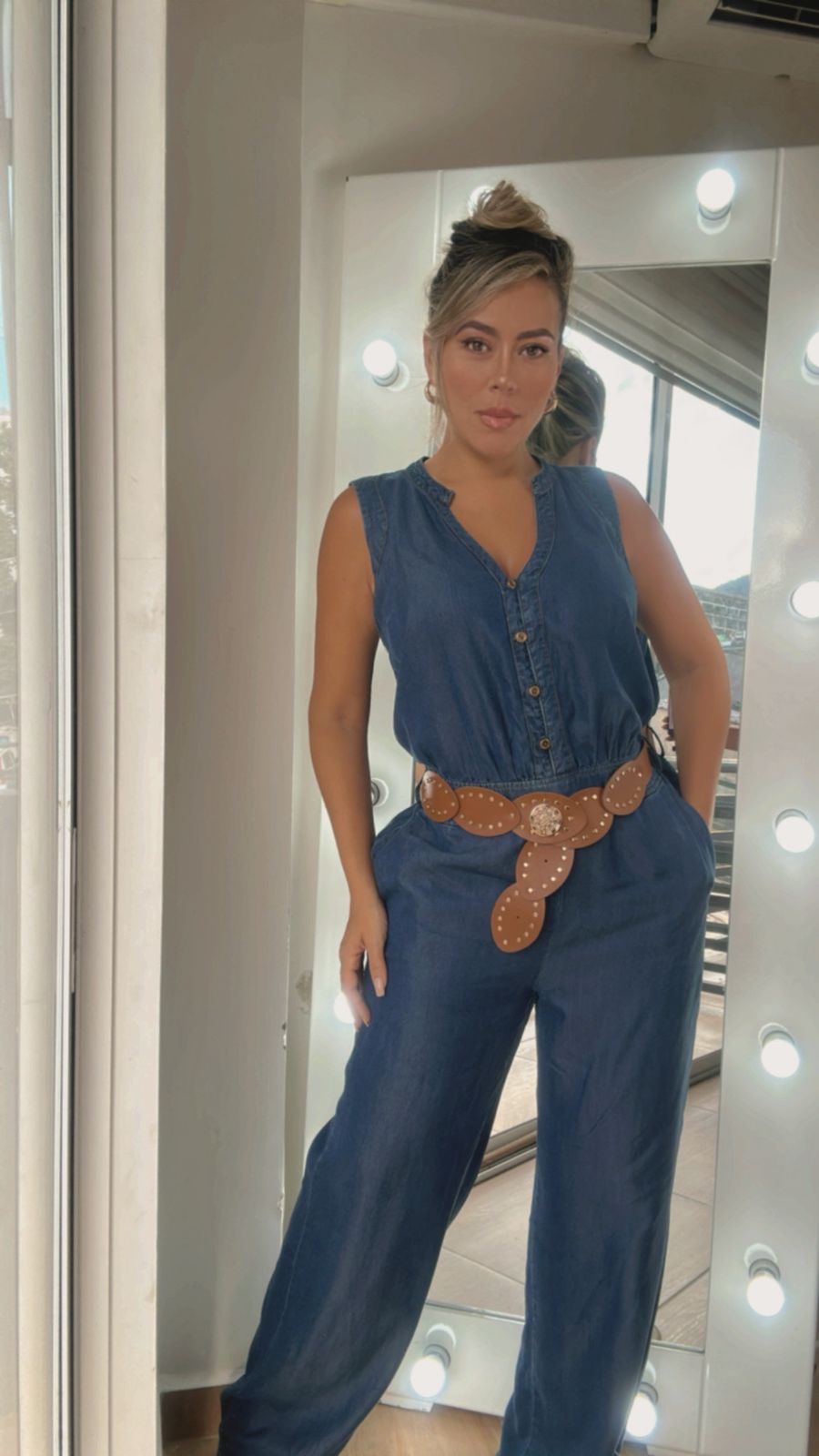 Enterizo largo en jean con cinturón, moderno y versátil, perfecto para un look casual con mucho estilo y comodidad.