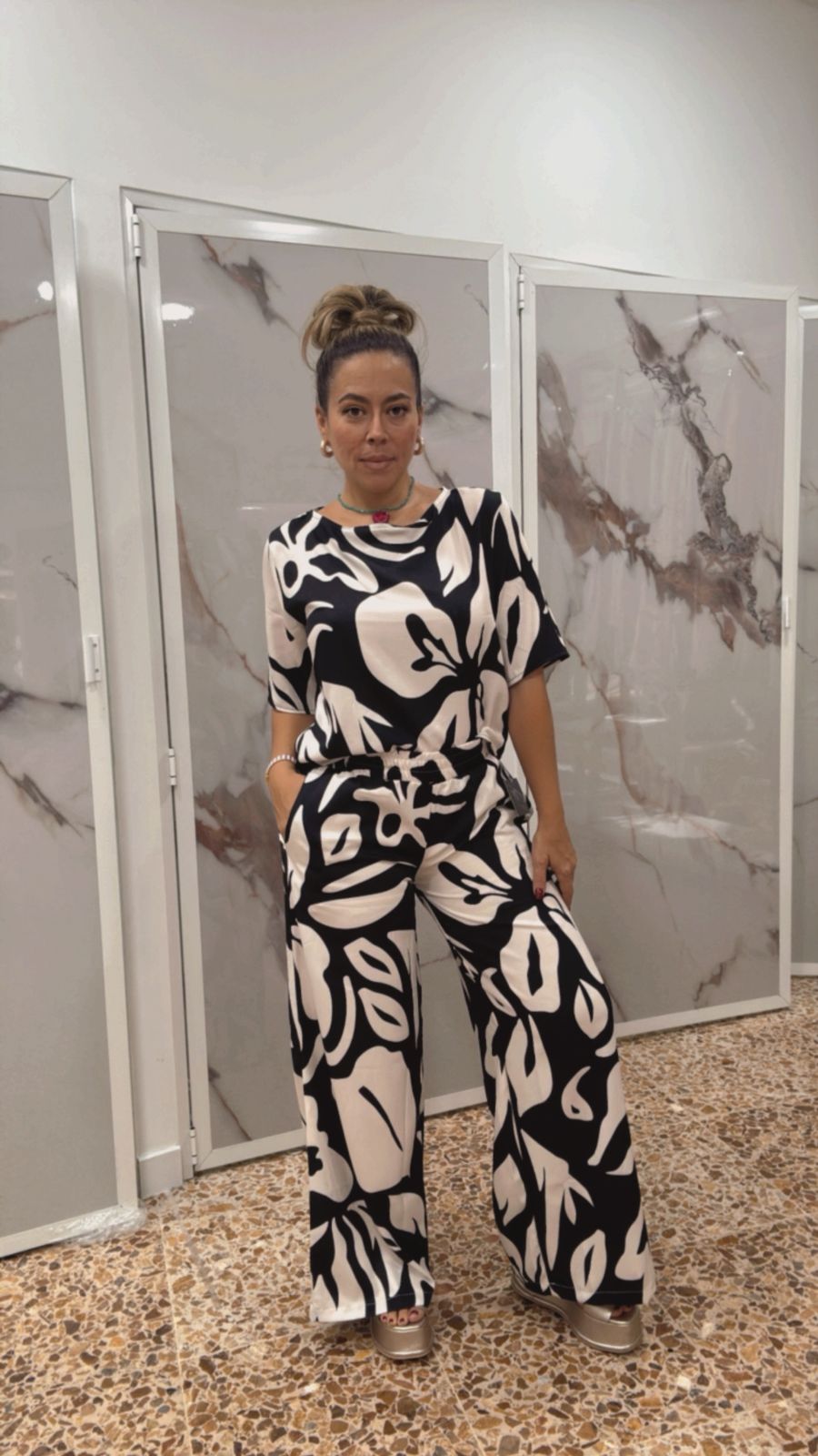 Set elegante en seda estampada blanco con negro, compuesto por camisa y pantalón de caída suave y fresca. Un diseño moderno, sofisticado y perfecto