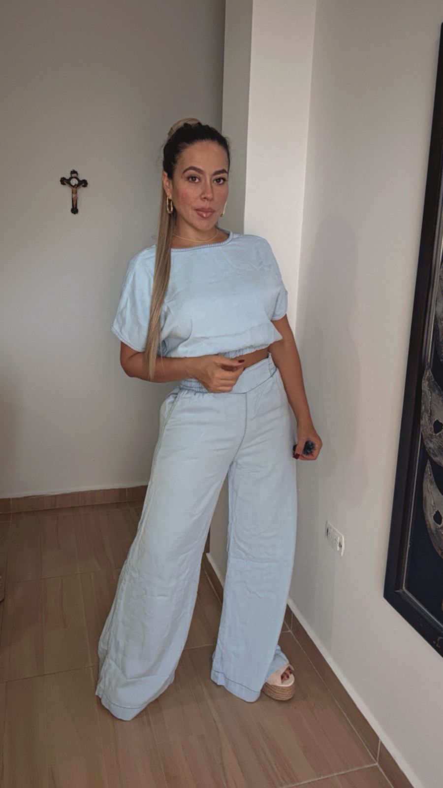 Lindo set en jeans claro, súper cómodo y a la moda. Fresco, versátil y perfecto para un look relajado con estilo todos los días.
