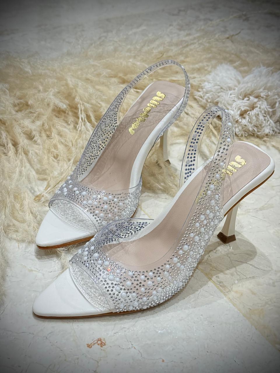 Tacones elegantes con delicada pedrería, sofisticados y femeninos, perfectos para realzar cualquier look en ocasiones especiales.