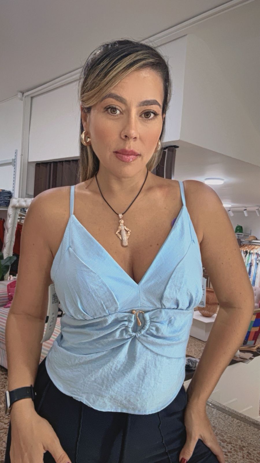 Top azul cielo de tirantes delgados con escote en V, fruncido central y argolla metálica decorativa. Fresco, femenino y perfecto para looks casualchic