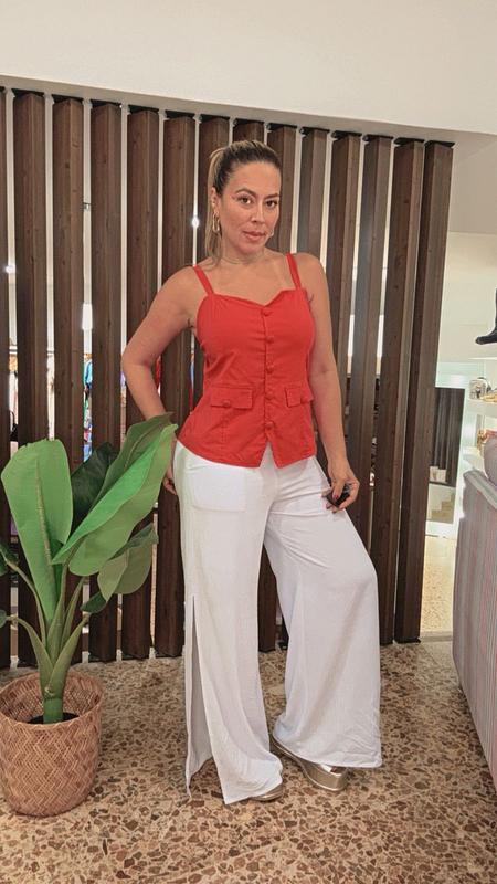 Top rojo sin mangas con tirantes delgados, escote corazón y botones forrados. Femenino, moderno y perfecto para un look casual-chic.