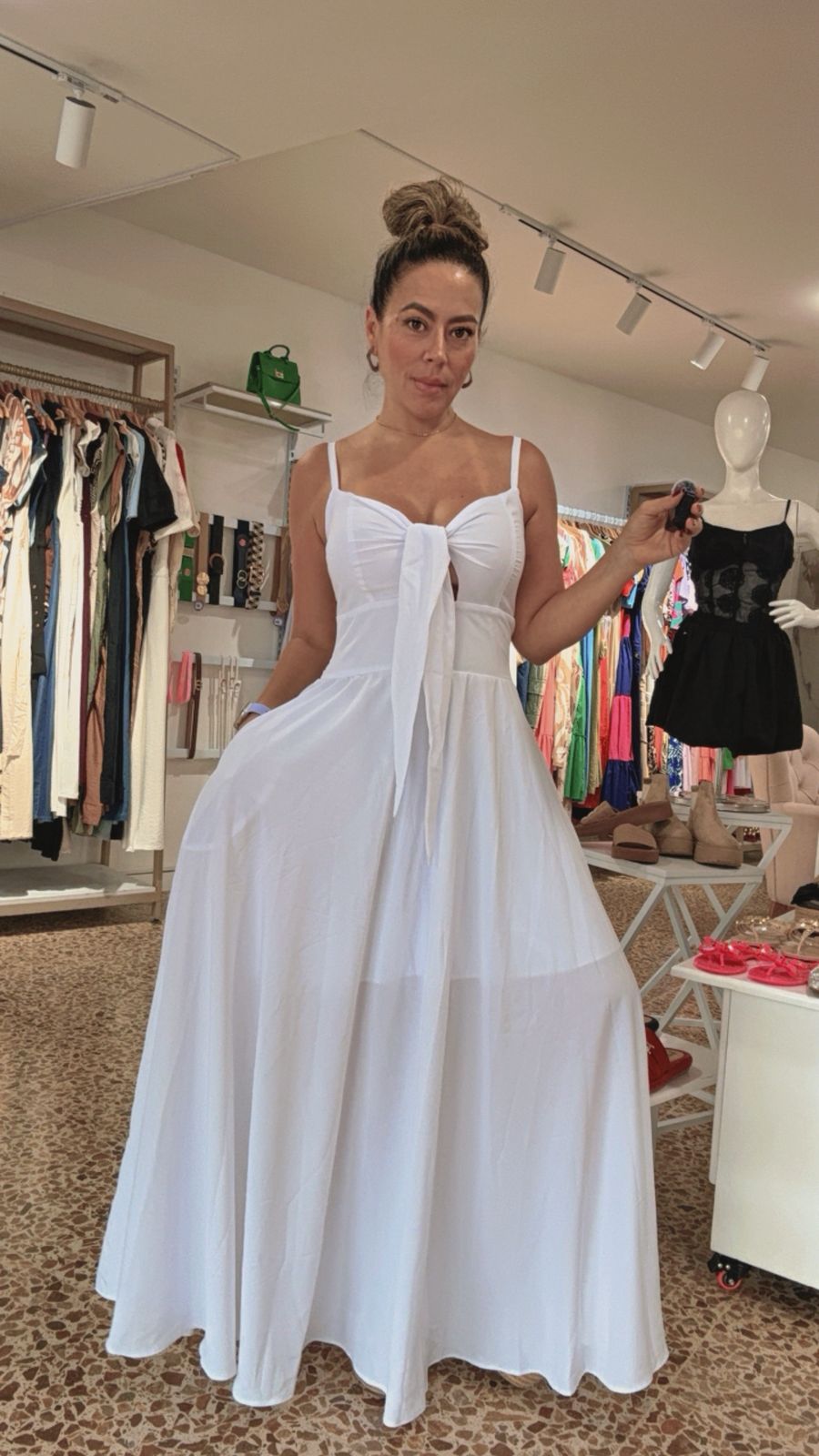 Vestido blanco corto con moño frontal estructurado. Femenino, moderno y perfecto para eventos, cenas o celebraciones. Tela suave y favorecedora