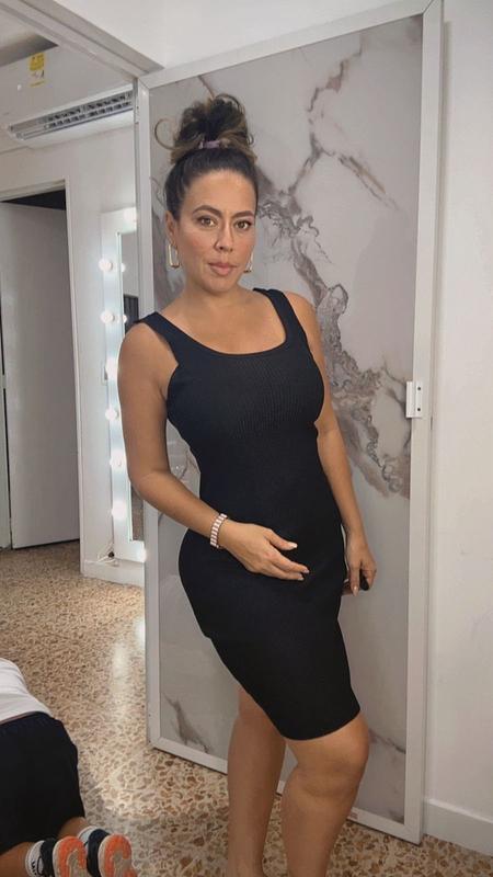 Vestido corto en hilo negro, con elongación ideal que se ajusta al cuerpo. Perfecto para combinar con tenis o sandalias y lucir cómoda, moderna