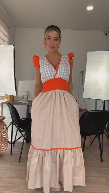Vestido largo en popelina estampada, con escote en cuello V y bolsillos laterales. Fresco, cómodo y perfecto para un look casual con estilo.