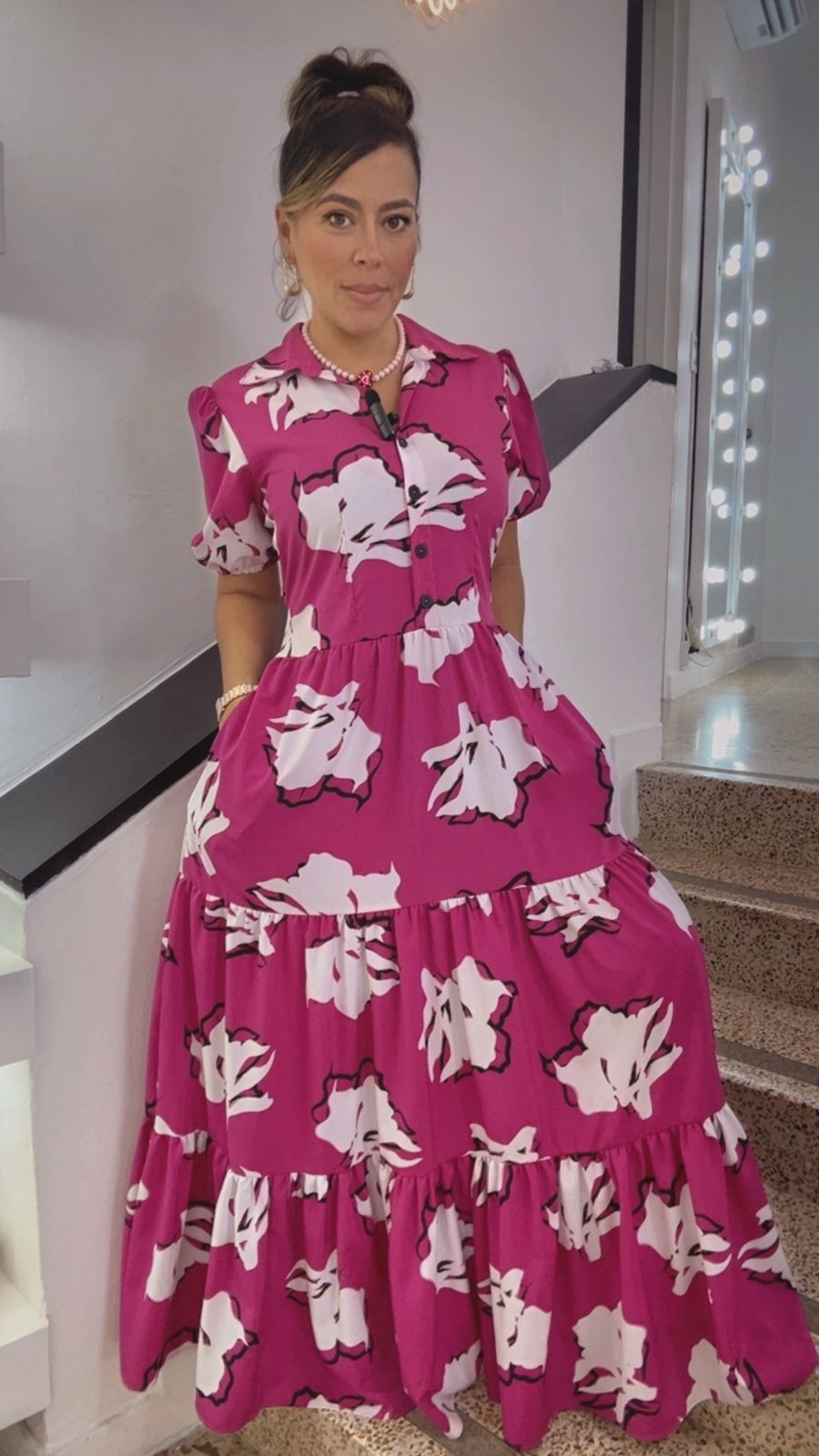 Vestido Largo Fucsia Floral Con Botones Y Falda Amplia