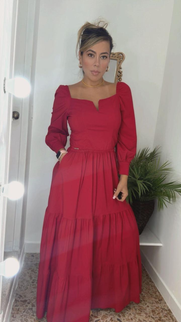 Vestido largo rojo con escote recto, abertura central y mangas puff. Femenino, elegante y llamativo, ideal para destacar en eventos especiales
