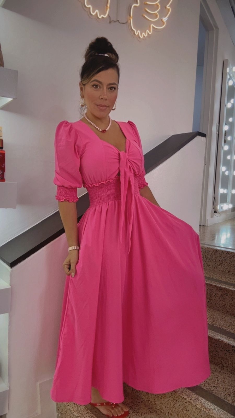 Vestido Largo Rosa Con Lazo Y Mangas Románticas Elegante