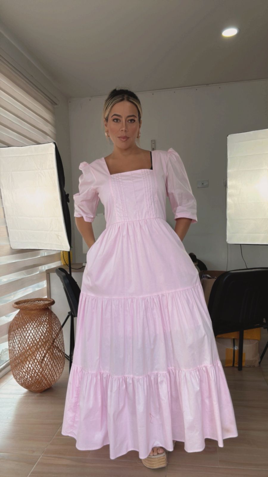Vestido largo rosado con mangas, confeccionado en popelina fresca. Incluye bolsillos laterales para mayor comodidad y estilo casual.