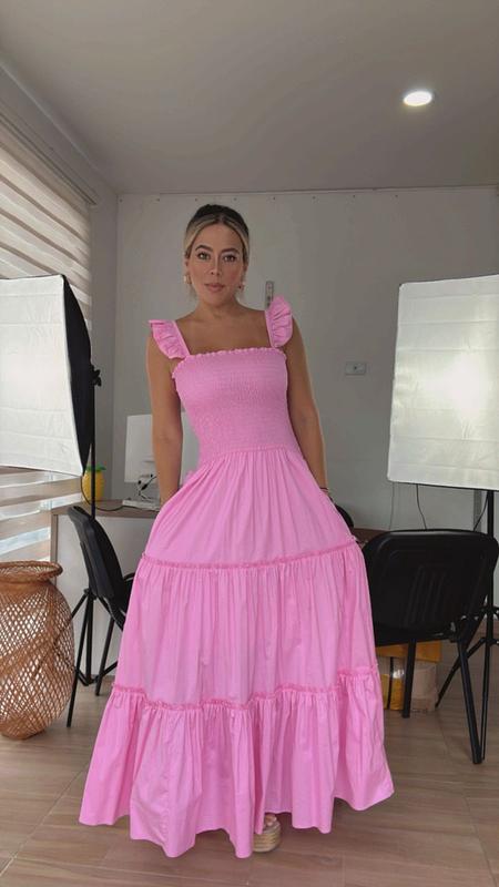 Vestido largo en tono rosado, con tiras finas y corte delicado. Perfecto para un look romántico y femenino.