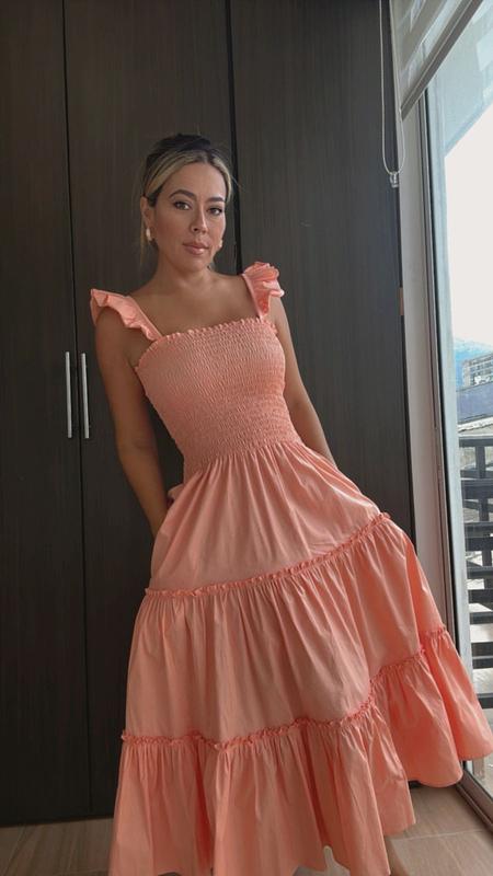 Vestido largo en tono salmon, con tiras finas y corte delicado. Perfecto para un look romántico y femenino.