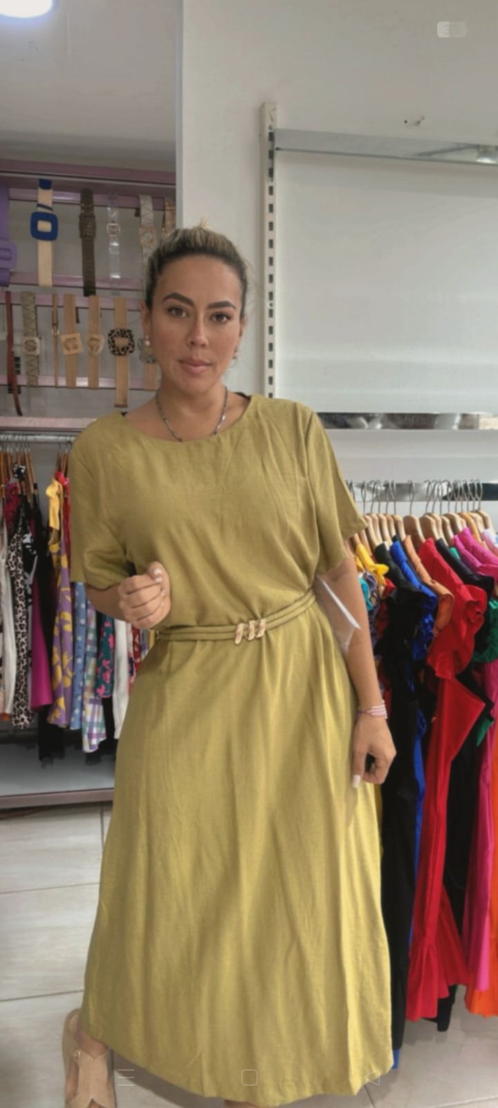Vestido largo verde tipo bata, cómodo y elegante, ideal para un look fresco y sofisticado en cualquier ocasión.