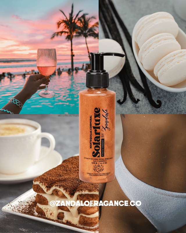 SolarLuxe Vainilla es una mantequilla corporal con efecto bronzer que aporta a la piel un tono dorado/bronceado natural, realzando el color de la piel mientras la hidrata profundamente. Además del efecto visual, envuelve el cuerpo en un aroma cálido y sofisticado de vainilla cremosa, especiada con cardamomo y un fondo ámbar elegante y sensual.
